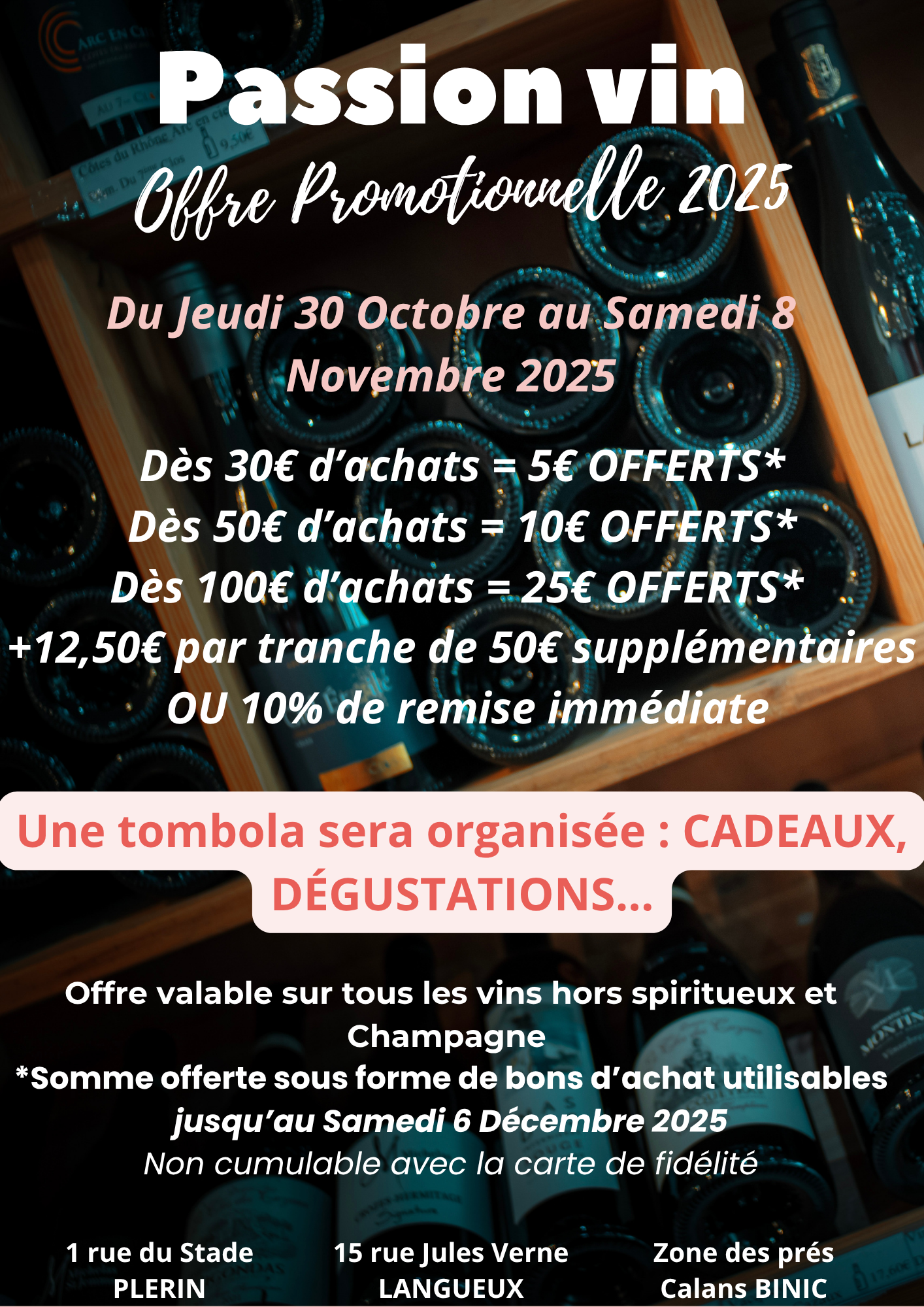 Du jeudi 30 octobre au samedi 8 novembre 2025, profitez de notre opération spéciale Passion Vin dans vos caves à Plérin, Langueux et Binic.